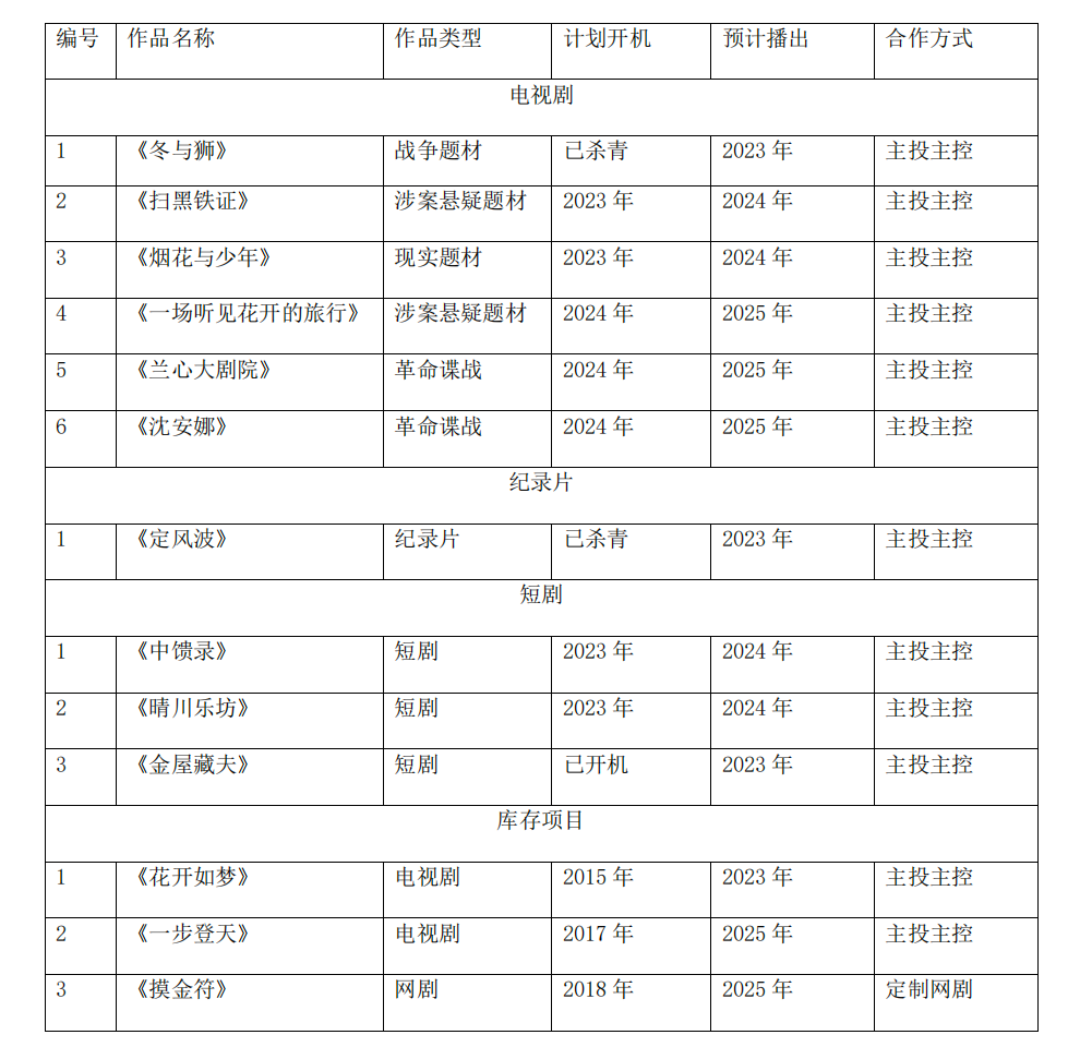 目前看来,公司已经解决了“去库存”的难题,走入储备、输出新项目的阶段。年报显示,2023年公司预推进以悬疑和谍战为主的6部电视剧,纪录片《定风波》将于2023年上半年播出,《兰心大剧院》《烟花与少年》等短剧项目也正在加快剧本创作。