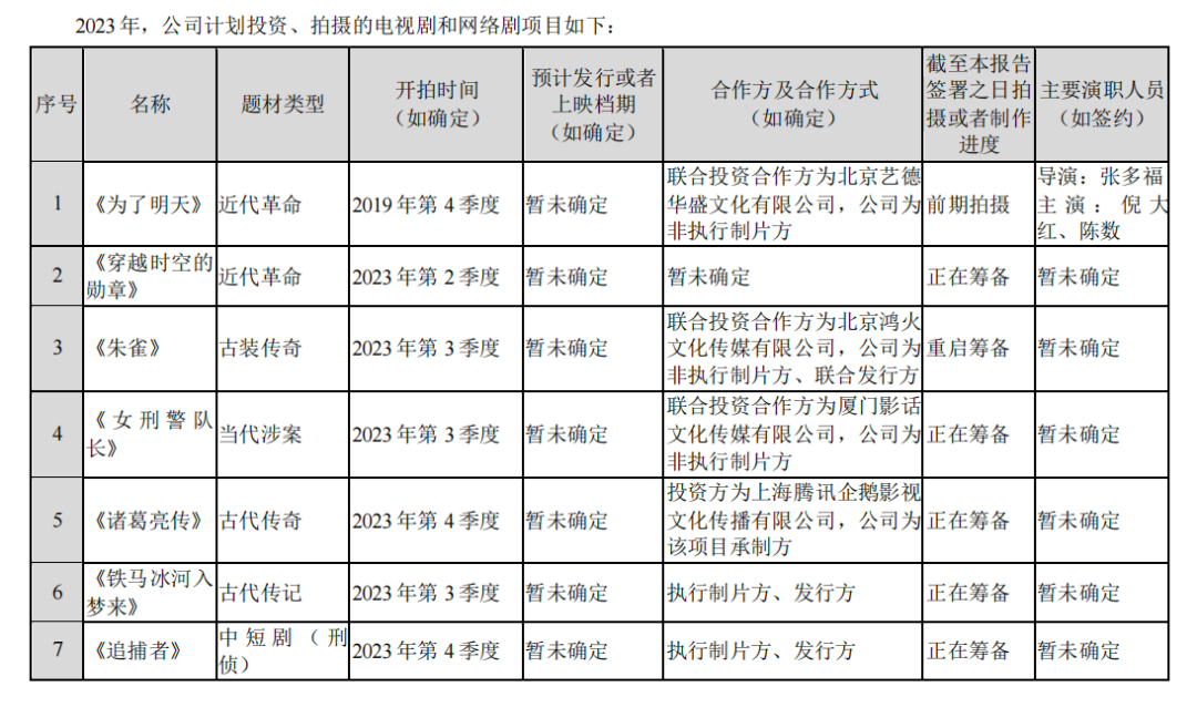 但公司在影视业务上的未来规划并没有跟上。来自腾讯3.6亿的大订单《诸葛亮传》仍旧处于筹备阶段,2023 年,公司计划投资、拍摄的电视剧和网络剧项目充满不确定性,大部分项目还处于筹备期,演职人员尚未确定。