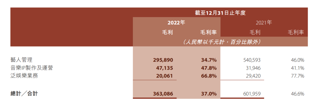 毫无意外,公司营收的大头是艺人管理业务,总计8.52亿,但该业务的盈利能力却有所下降,这主要由于2022年艺人享有较高的收入分成,以及公司产生以权益結算的股份支付。