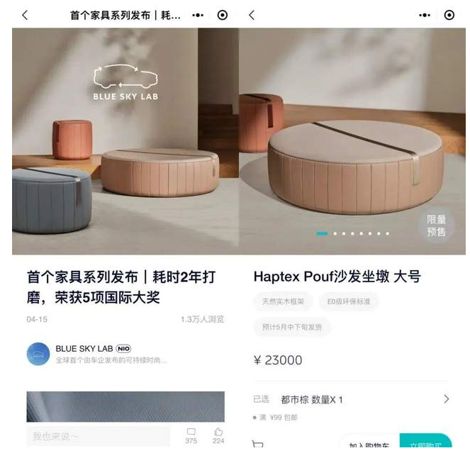 近一段时间,蔚来又出圈了,但却不是因为自家的车,而是周边产品。有网友发现,在蔚来汽车的APP和小程序商城上出现了一款沙发坐凳,最高售价竟然高达23000元。