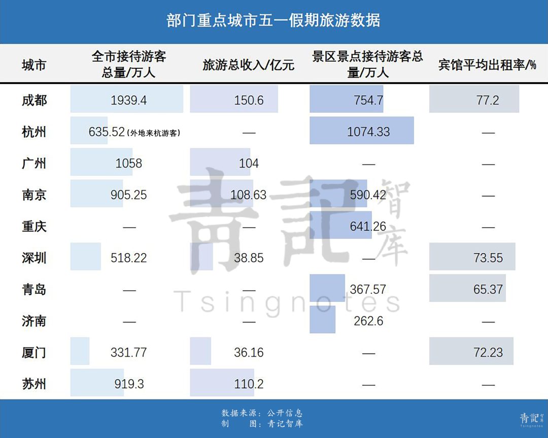 成都和杭州等热门旅游城市公布的数据更为详细,同时也分析了游客来源。