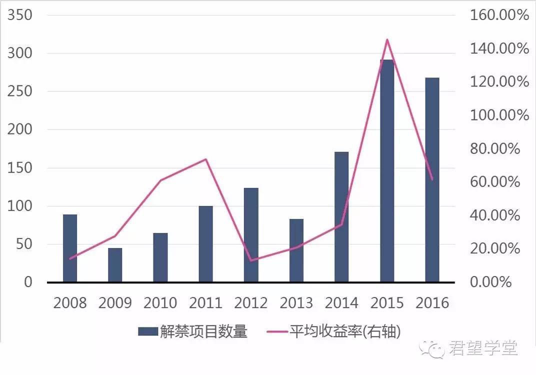 图2 2008年1月-2016年9月一年期定增项目解禁数量和平均盈利率