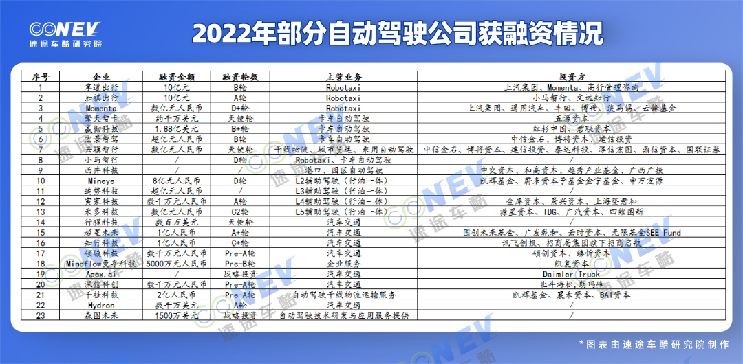 虽然自动驾驶整个赛道面临着技术难突破、商业化难落地、资本市场难融资的情况,但业内一致认为加速商业化进程能够帮助自动驾驶摆脱资本危机。由此,Robotaxi以及无人重卡成为了新的“兵家必争之地”。