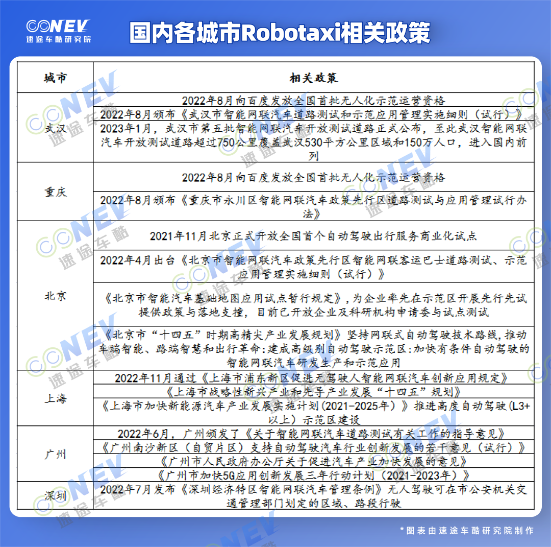从前文所列图表中,我们还能看到北京、上海、广州、深圳等城市为加快自动驾驶汽车商业化落地出台的相关政策。