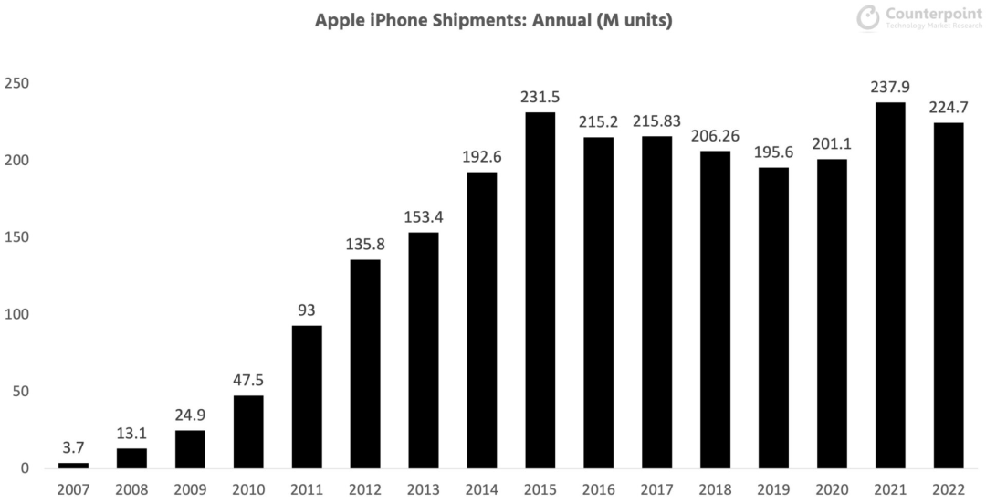 2007年1月,被乔布斯称为“苹果将彻底改变手机”的第一代iPhone正式发布,并于当年6月底上市销售。到2018财年末苹果最后一次在财报中公布产品销量,iPhone十二年累计销售14.68亿部,在过去11个财年持续贡献了超50%的营收。另据Counterpoint数据,2007-2022年,iPhone累计销量达到23.92亿部,市场份额也由最初的3%升至18%,全球排名第二。
