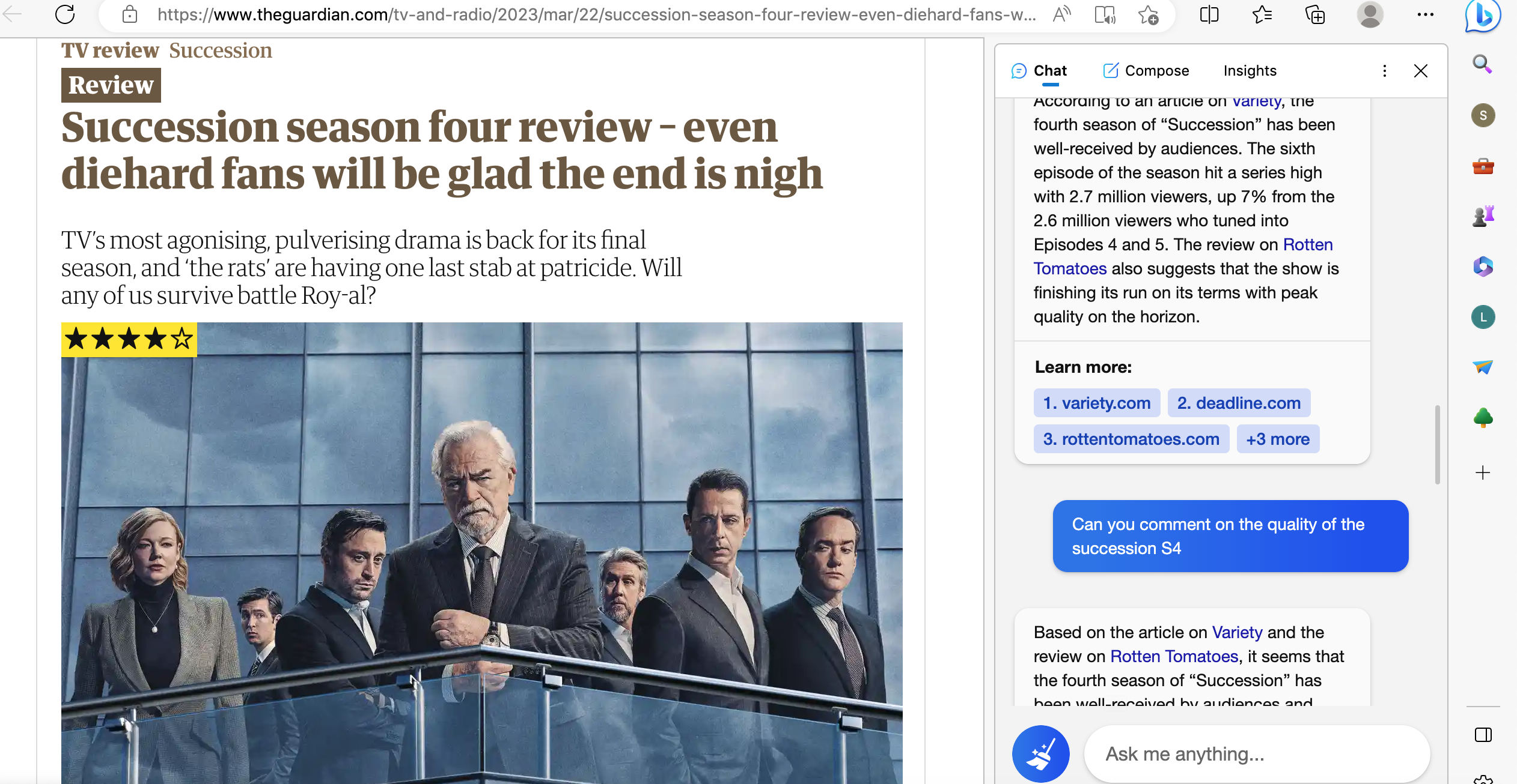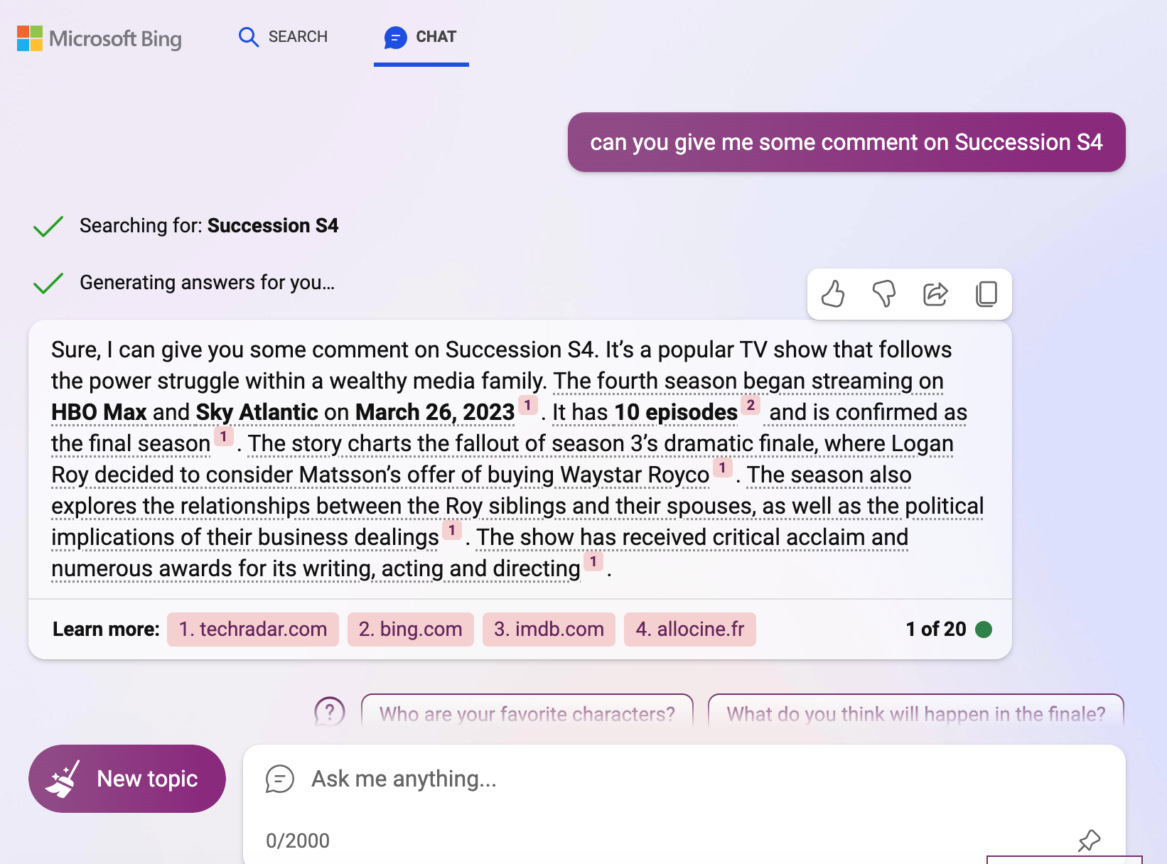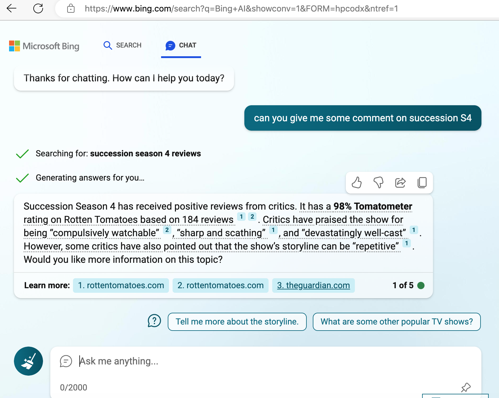 精确型回答风格是平衡型回答某种意义上的细化,面对同样的问题,答案中展示了烂番茄评分和参与评分的影评人人数,摘录了其中重要影评人的意见,还提供了正反两方意见作为参考。在答案中,Bing为每处剧评都做了来源注脚,附着在答案之后的几处链接上。