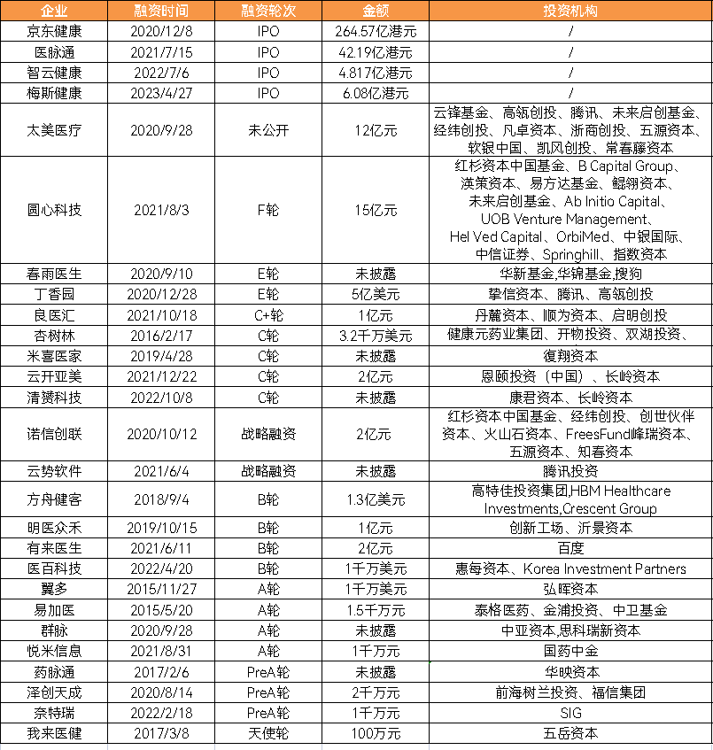 各细分领域也纷纷出现融资轮次靠后企业,初显头部地位,如行业不乏京东健康、医脉通等头部医疗互联网上市企业在现有的用户及数据基础上新增医药数字营销板块。此外,凭借针对医生的专业学术内容打造切入数字营销领域的企业中,梅斯健康于2020年完成1亿元大额preIPO融资后于2023年4月跻身上市企业行列;而在火热的虚拟代表领域,以清赟科技为代表的数字化企业也走到C轮融资阶段,展现强劲发展势头。