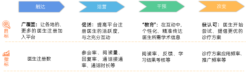 接下来是对医生的运营,保障医生进入平台后的活跃度,让触达环节获得的静态流量变为真正能够进行干预的有效流量。我们在调研中发现,更前沿的学术内容、更实用的诊疗相关活动、更贴近患者管理的服务更能吸引医生的参与,达成良好触达和运营的指标。
