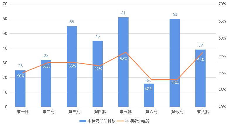 各批国家集采药品中标品种数和平均降价幅度,资料来源:动脉橙产业智库