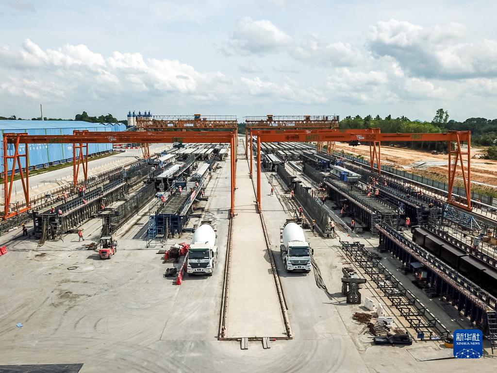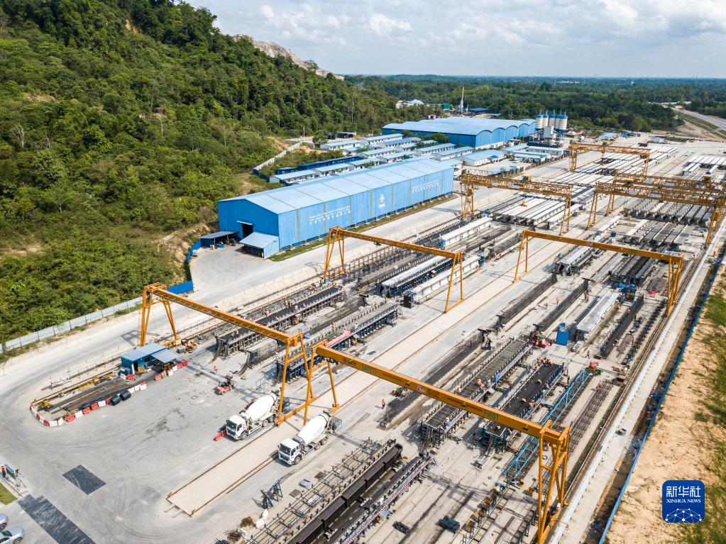 这是4月26日在马来西亚吉兰丹州拍摄的马东铁项目一分部制梁场(无人机拍摄)。新华社记者 朱炜 摄