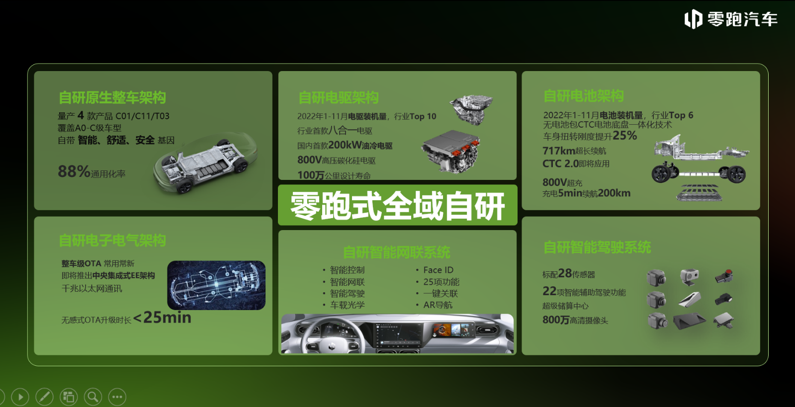 回归到产品上,全域自研的另一好处是让零跑汽车的产品一代更比一代好。比如零跑的电驱从水冷到油冷,产品从T03到C11到C01,再到新平台,每一个都在不断进化。将来高通8295芯片+中央域控制One Box的产品,零跑的C11、C01均可实现同步切换。