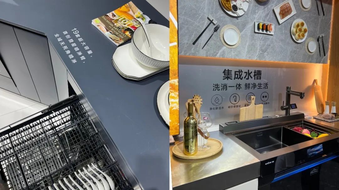 集成烹饪中心以“烟机+灶集成”的方式呈现,成为此次展会的亮点产品,与集成灶共同成为集成厨电的重要组成部分。集成烹洗两件套也是各大厨卫品牌推出的重点套系产品,以集成灶和集成洗碗机两台产品满足厨房的全部功能,实现紧凑空间内理想厨房的更多想象。可以预见,集成烹洗两件套,甚至是集成了净热一体机的集成“烹洗饮”多件套,将以强大的空间减法优势,在2023迎来元年。