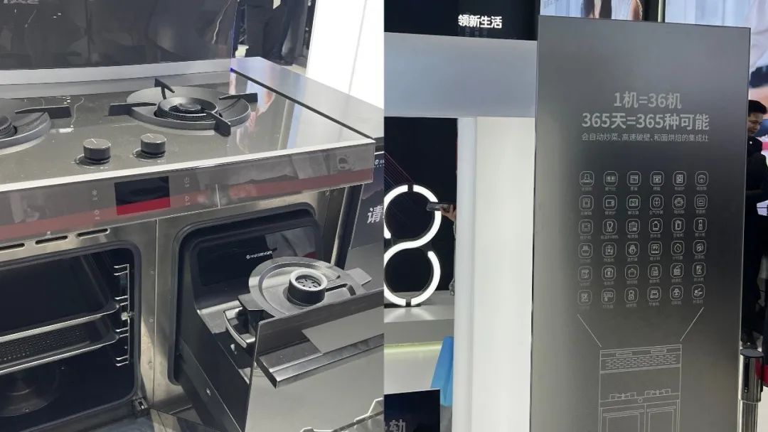 集成厨电产品的向来最大优势是空间减法,此次AWE展会的集成产品的展示面之一也是将更多功能模块集成进有限的空间。例如集成灶产品纷纷主打蒸烤独立款,“蒸烤+蒸”组合款集成灶也是重点方向,亿田推出集成了电饭煲模块的集成灶产品,火星人更是亮出了“1机=36机”的概念新品,集合烟灶微蒸烤、电饭煲、料理机等多项模块。