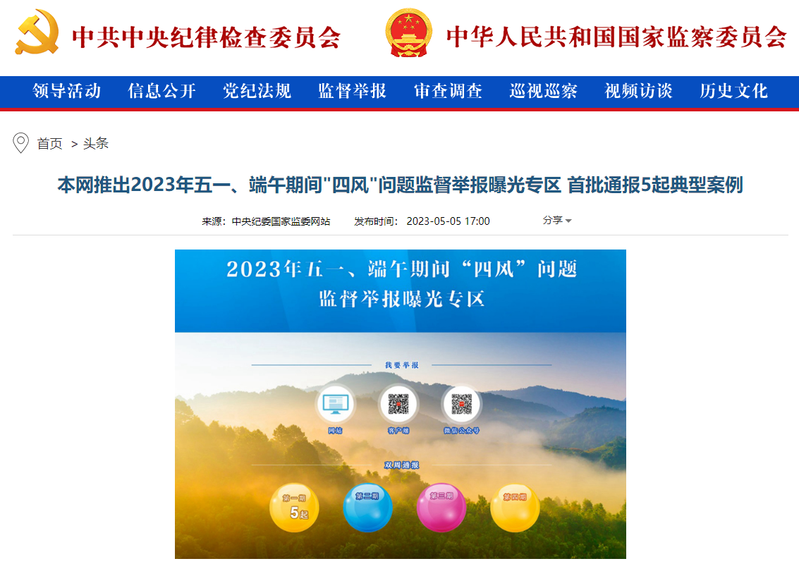 为持续强化正风肃纪,中央纪委国家监委网站推出“2023年五一、端午期间‘四风’问题监督举报曝光专区”,加大典型案例通报曝光力度,不断释放一抓到底、一刻不松的强烈信号。专区开设“我要举报”窗口,链接中央纪委国家监委统一举报平台,欢迎广大网友通过网站、手机客户端和微信公众号,对节日期间易发多发的违规公款吃喝、在隐蔽场所接受宴请、“舌尖上的浪费”、以电子红包和快递物流方式“隔空送礼”、公车私用、违规操办婚丧喜庆等问题进行举报。专区“双周通报”栏目从5月5日起,分4次集中对典型问题点名道姓通报曝光,强化警示震慑。