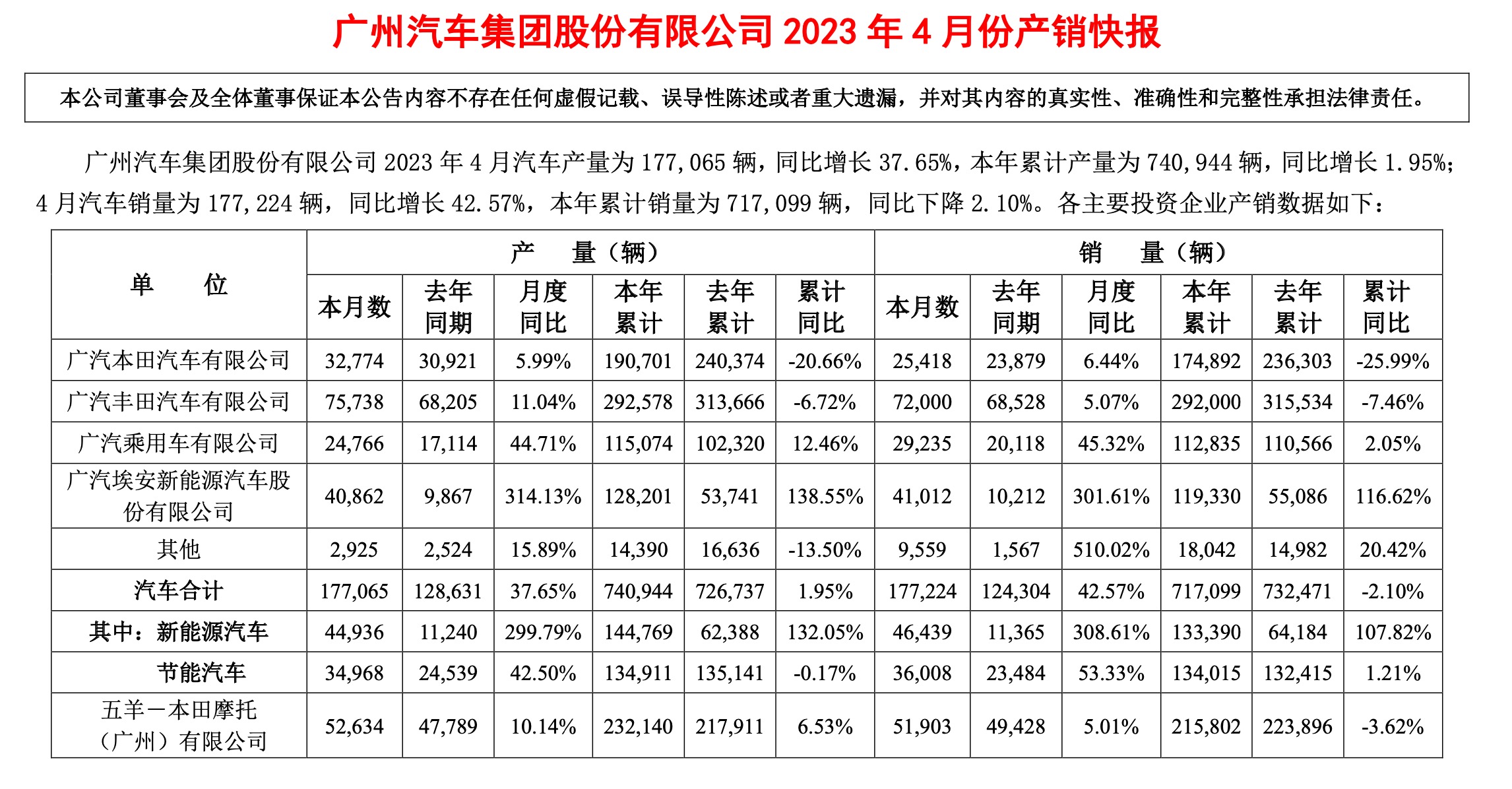 广汽集团5月5日公告,4月汽车产量为177,065辆,同比增长37.65%,本年累计产量为740,944辆,同比增长1.95%;4月汽车销量为177,224辆,同比增长42.57%,本年累计销量为717,099辆,同比下降2.10%。