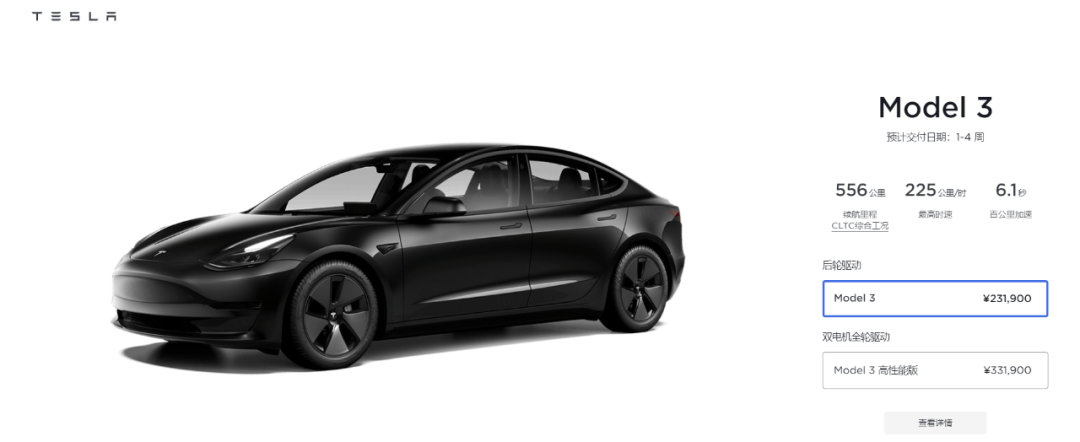 特斯拉Model 3最新国内售价,截图自特斯拉中国官网