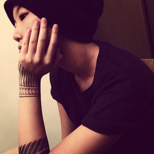 童童的纹身非常张扬,而且似乎都上瘾了。手腕和大臂处的大面积纹身,Rock范十足。