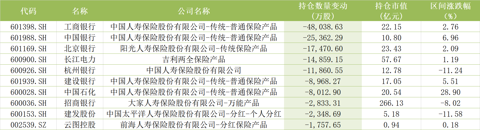 从减持个股来看,险资明显在银行股的操作上达成了一致共识。前十大减持数量最多的个股中不仅六只来自银行股,且四只操作出自中国人寿。