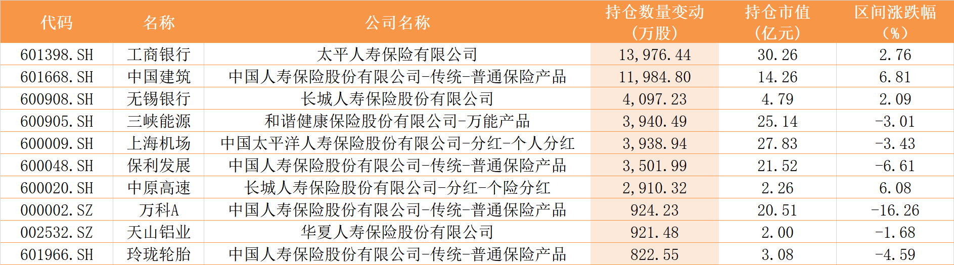 其中,太平人寿公司一季度买入1.4亿股工商银行(601398.SH),直接将工商银行送上榜一位置;“中国人寿-传统-普通保险产品”一季度买入1.2亿股中国建筑(601668.SH),位列榜二。