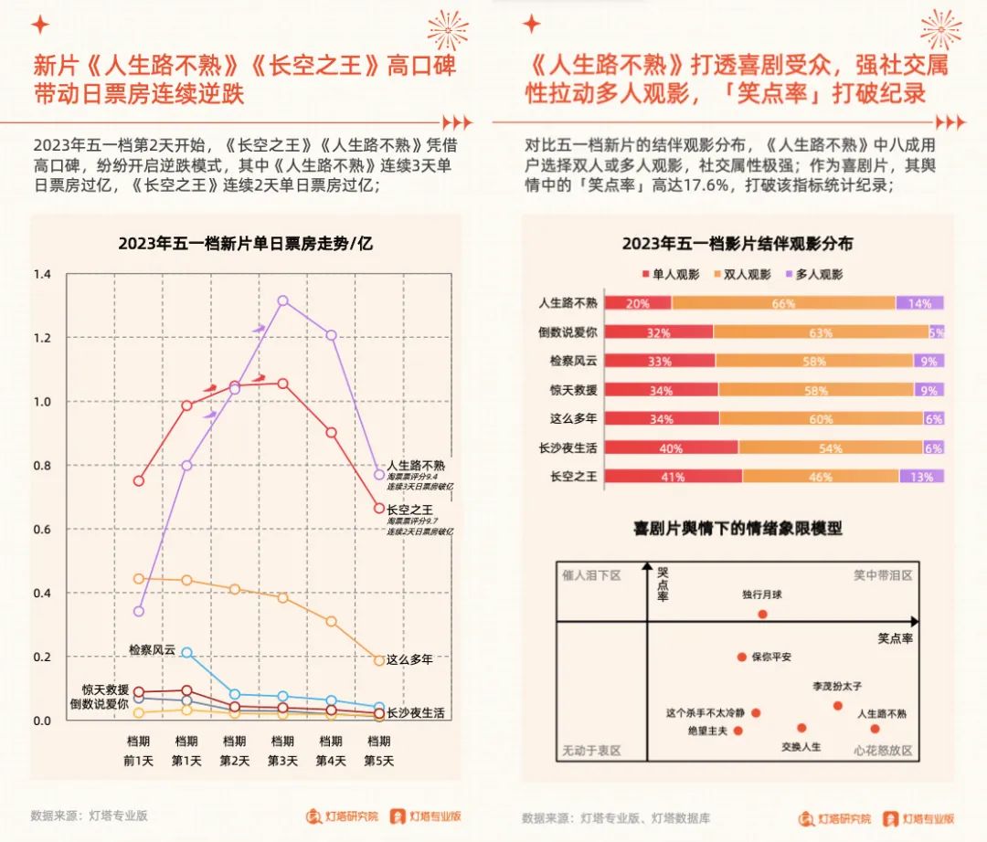 《人生路不熟》能够夺冠,行业普遍认为是沾了“档期内唯一一部喜剧片”的光。据灯塔研究院发布的《2023年五一档市场洞察报告》(以下简称《报告》)显示,《人生路不熟》中八成用户选择双人或多人观影,舆情中“笑点率”高达17.6%。