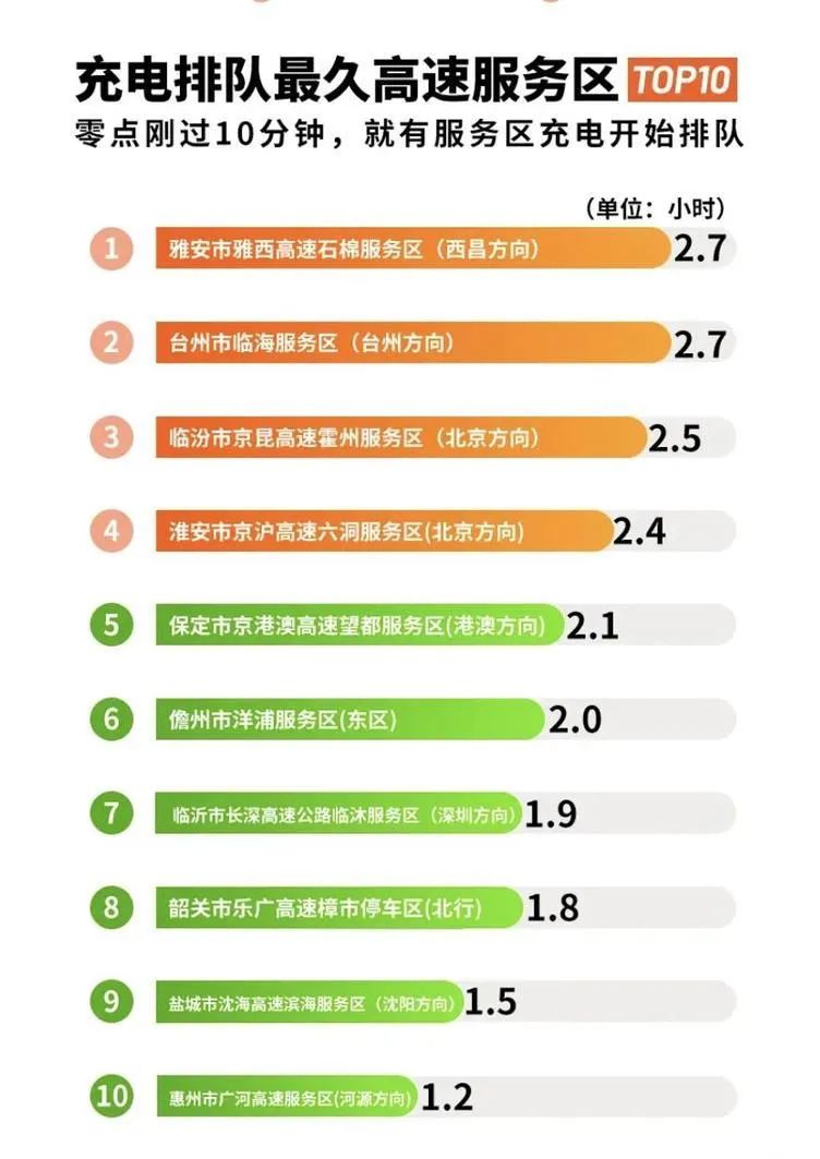 榜单前十名中,充电排队时长超过两小时的高速服务区有六个,其中,雅安市雅西高速石棉服务区充电站和台州市临海服务区充电站的等待时长最为惊人,高达2.7小时。