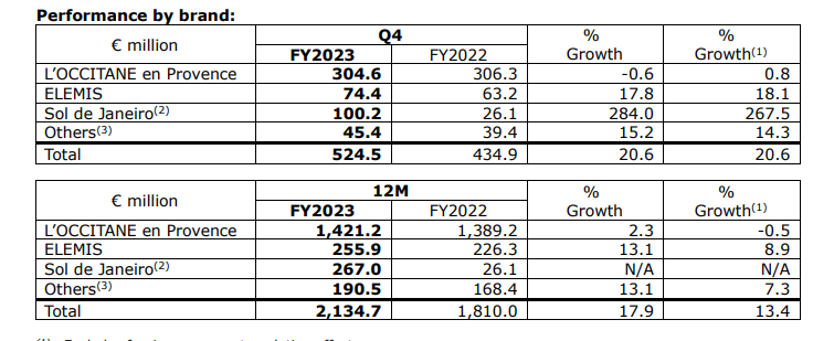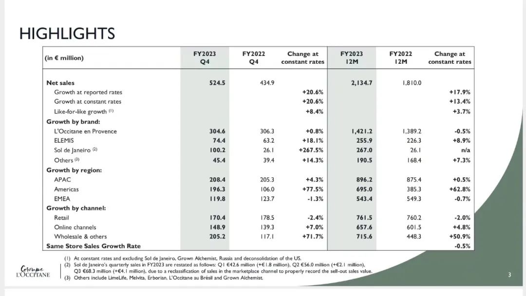 财报称,欧舒丹第四季度的增长,得益于品牌欧舒丹充满活力的旅游零售渠道,以及在中国解除疫情后销售势头的改善。2023财年的增长主要由品牌Sol de Janeiro的出色表现和ELEMIS的稳健增长推动。