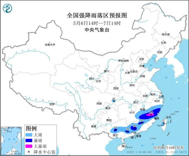 南方本轮降雨今天进入最强时段。中央气象台5月6日10时继续发布暴雨蓝色预警称,预计5月6日14时至7日14时,江西中南部、浙江南部、福建西部和北部、广西中东部、广东中北部等地部分地区有大到暴雨,其中,福建北部等地部分地区有大暴雨(100-140毫米)。上述部分地区伴有短时强降水(最大小时降雨量20-50毫米,局地可超过60毫米),局地有雷暴大风或冰雹等强对流天气。
