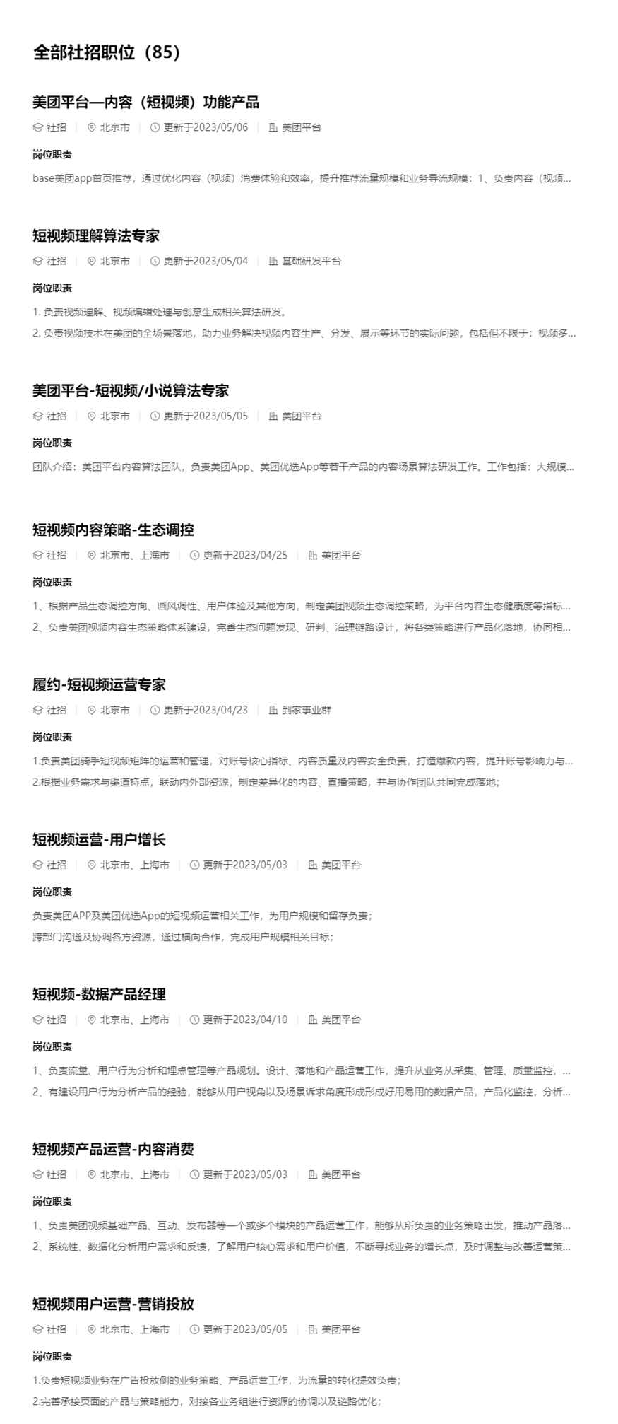 美团招聘官网上挂出了多个短视频业务相关岗位需求,包括了战略分析、后端研发、算法工程、产品运营和数据分析等不同方向,基本覆盖短视频赛道全链路。