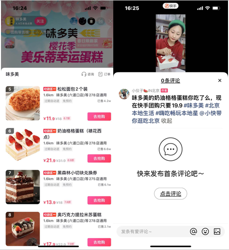 去年9月,快手也宣布将本地生活服务升级为一级部门,和主站、商业化、电商、国际业务属于同一层级。目前,快手的本地生活服务以团购为主,相当于在模仿抖音的老路。根据小可提供的消费对比,抖音和快手上的产品价格基本差距不大。以味多美的奶油格格蛋糕为例,抖音直播的价格为21.9元,快手探店的价格为19.9元。
