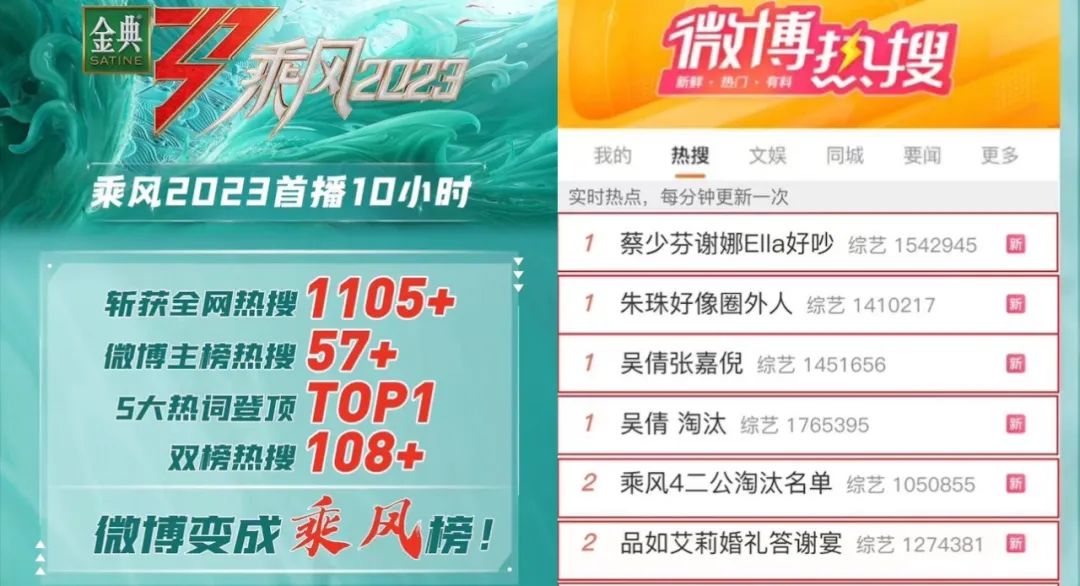 首播仅10小时,斩获全网热搜1105+,#蔡少芬谢娜Ella好吵#、#朱珠好像圈外人#、#吴倩张嘉倪# 等话题接连冲上微博热一,《乘风2023》(犀牛君还是习惯叫它《浪姐4》)仍是内娱综艺里的话题顶流。