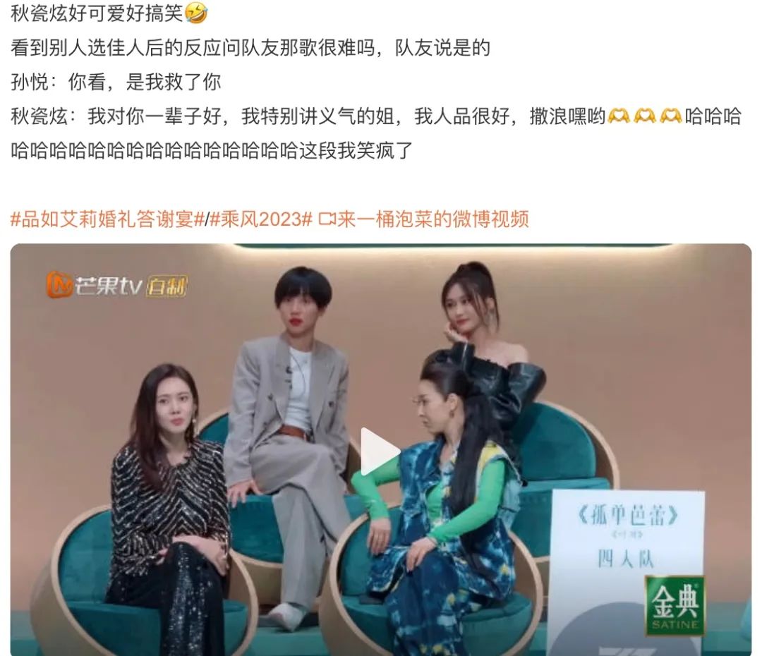 整体来看,这季真人秀主打一个《搞笑女2023》,观感顺畅而有趣。首期贡献的真人秀爆梗就应接不暇,前有蔡少芬独家自曝女儿支持自己来《浪姐》的原因——“想看你在台上掉下来是怎么样的”,后有秋瓷炫被孙悦“解救”不用去唱跳组,脱口而出“我会对你一辈子好!”、“我很讲义气的,姐!”