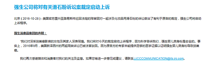 强生公司通过官方网站发出最新声明,表示不服初审判决,并将启动上诉程序。强生中国公关部负责人就此回复《化妆品财经在线》(微信号:wwwcbocn)记者:“这三起官司都只是初审,而非终审判决,强生已经提起上诉。”