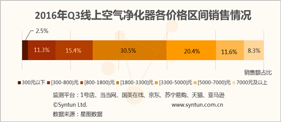 空气净化器方面,1800元以下的产品市场份额下滑幅度高达27.3%;3300元以上的产品份额上涨幅度最大,达到29.1%。其中7000元以上的高端产品份额由去年同期的1.3%上涨至8.3%,说明消费者对空气净化器的价格敏感度正在降低。