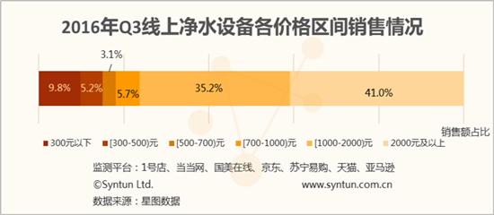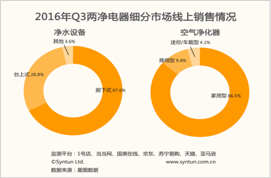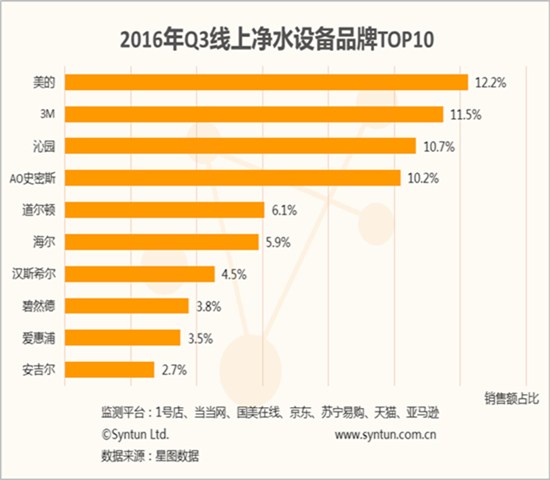 据了解,近年来雾霾高发使得空气净化器行业备受瞩目,进入空气净化器行业的品牌较多:线上空气净化器品牌超过700个,品牌数量多、且较杂乱,线上净水设备品牌数量则不到300个;再加上净水设备行业较空气净化器行业起步稍早,因此,截至今年第三季度,线上净水设备品牌格局已基本稳定。