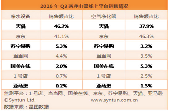 据线上净水器和空气净化器(以下简称两净)的相关销售数据显示,在线上两净市场中,天猫、京东依然是最大的赢家。此外,线上两净市场品牌格局已呈现出差异化,高端产品和细分市场占有率将越来越大。