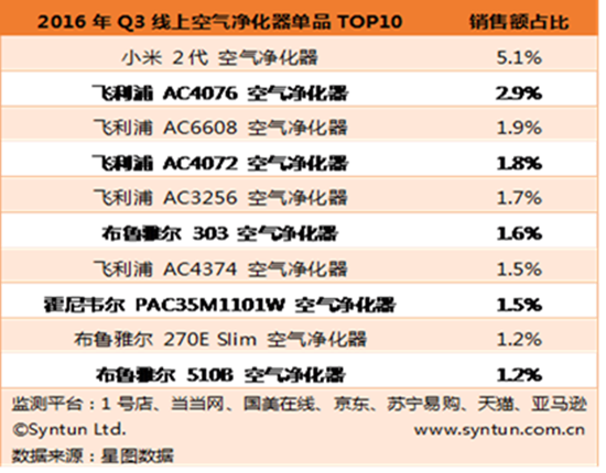 相反,线上空气净化器市场,品牌格局变化较大。品质较好、价格合理的外资品牌飞利浦一直是线上空气净化器市场的领头羊,夏普、松下也凭借口碑和质量一直在线上保持较好的份额。而3M、净美仕、亚都等品牌去年还在Top10内,今年却被高端品牌布鲁雅尔、霍尼韦尔挤掉,尤其是布鲁雅尔,其超高的市场均价(布鲁雅尔平均成交价为4294元,而空气净化器线上平均成交价为1498元)并没有阻挡国内消费者的购买热情,这也使得布鲁雅尔从去年Q3的线上第18名一跃成为今年Q3的线上第2名。今年8月份布鲁雅尔被联合利华收购,已在中国市场深耕多年的联合利华接下来也将促进布鲁雅尔在中国市场的销售。