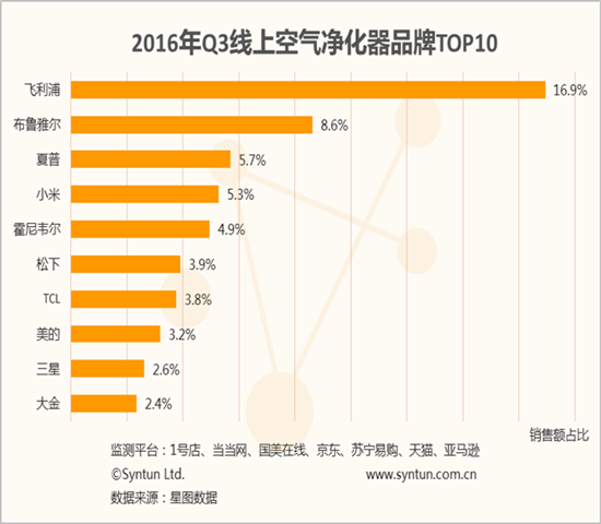 空气净化器方面,家用型仍是主流,商用型开始走向爆发期,今年三季度其市场份额达9.4%,同比上涨近9个百分点,迷你、车载型虽然市场份额最小,但有车一族的数量正在急剧增:根据公安部交管局数据显示,截至2015年底,我国汽车保有量达1.72亿辆,新注册量和年增量均达历史最高水平,这表示这个垂直细分的行业也有巨大的市场。以线上份额第一的飞利浦为例,其线上店铺中,以销售车载型飞利浦空气净化器的飞利浦磐通专卖店最近几月持续保持在飞利浦店铺的TOP10中,就可以说明迷你、车载领域的空气净化器仍然有巨大上涨空间。