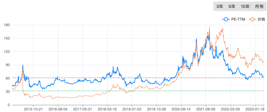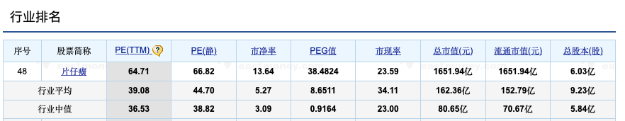二级市场上,除了股价、市值,片仔癀的市盈率也居高不下。市盈率市盈率亦称本益比,=总市值/归母净利润(TTM),是最常用来评估股价水平是否合理的指标之一。一般认为市盈率越高,股价越被高估。