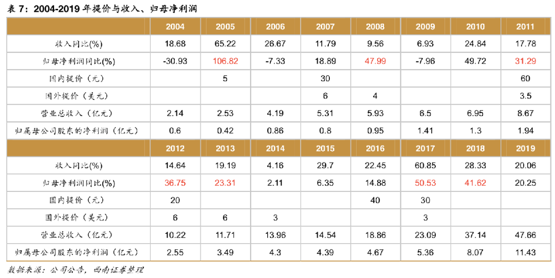 2004年其归母净利润下降30.93%,2005年3月,片仔癀便将出厂价和零售价提升5元,同年实现收入同比增长65.2%,归母净利润同比提升106.8%。2006年归母净利润再次下降7.33%,2007年1月、3月、11月三次提价,其中,国内提价30元,国外提价6元,2008年片仔癀收入提升9.6%,归母净利润提升48%。