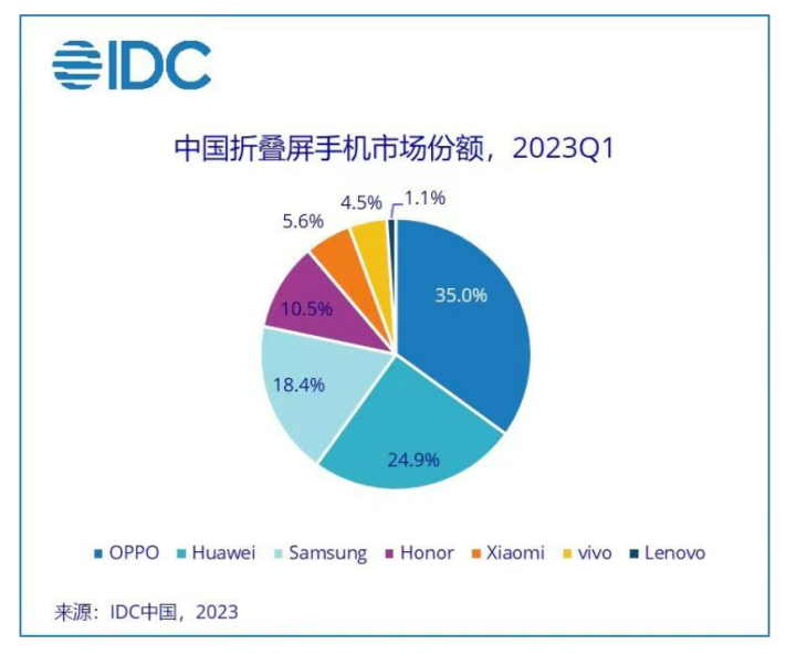 在市场层面,与三星折叠屏在海外市场拿到了全球80.9%的市场份额一骑绝尘不同的是,“国产派”唱起了“主角”。IDC最新数据显示,2023年第一季度,OPPO以35.0%的市场份额位列国内折叠市场第一,紧随其后的是华为(占比24.9%)、三星(18.4%)和荣耀(10.5%)。