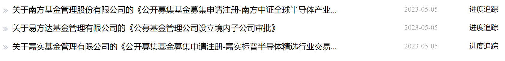 具体来看,嘉实基金上报的是嘉实标普半导体精选行业交易型开放式指数证券投资基金(QDII),博时和南方基金上报的是跟踪中证全球半导体产业指数的ETF。而在5月4日,富国基金也上报了富国中证全球半导体产业交易型开放式指数证券投资基金(QDII)。