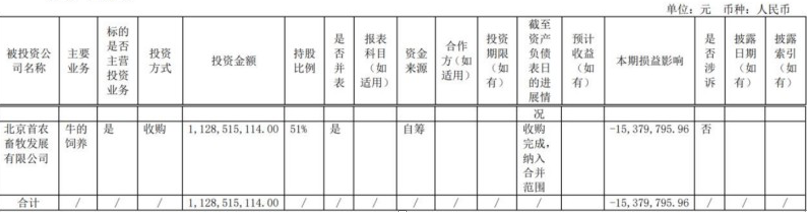 2022年年报显示,三元股份对首农畜牧的投资金额为11.29亿元,收购完成后纳入合并报表,在2022年对三元股份的损益影响为-1537.98万元。