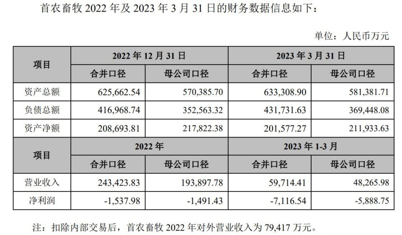不仅如此,首农畜牧的净利润(合并口径)在2020年及2021年1-5月还比较优秀,分别为2.08亿元、8043.76万元。但到了2022年,首农畜牧净亏损1537.98万元,2023年1-3月又出现了7116.54万元的巨额亏损。