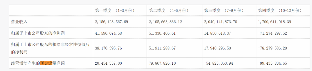 从时间线上看,2022年第一第二季度,三元股份经营活动产生的现金流量净额还均为正值,分别约为2045万元、7987万元。到了第三季度和第四季度,这一数据骤然下降到-5482万元以及-9943万元。