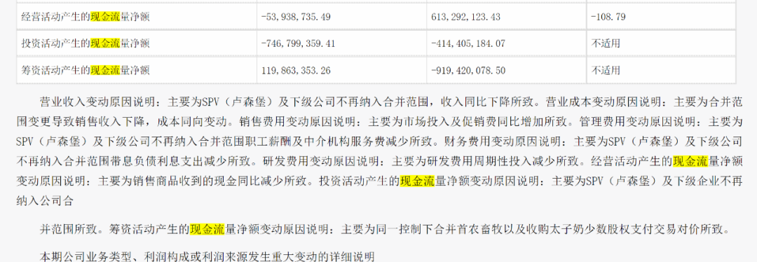 对此三元股份给出的解释为,经营活动产生的现金流量净额变动原因主要为销售商品收到的现金同比减少所致。投资活动产生的现金流量净额变动原因主要为SPV(卢森堡)及下级企业不再纳入公司合并范围所致,筹资活动产生的现金流量净额变动原因主要为同一控制下合并首农畜牧以及收购太子奶少数股权支付交易对价所致。