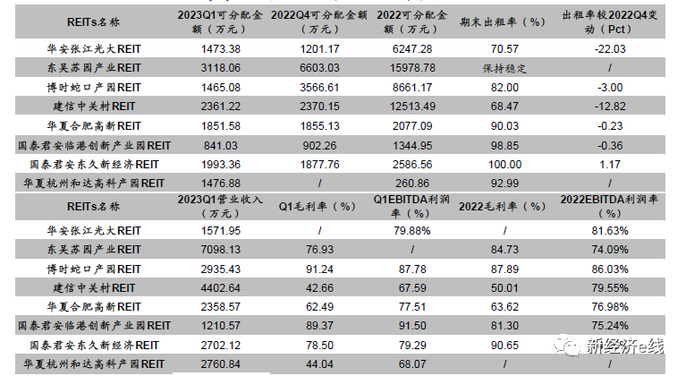 新经济e线注意到,总体来看,公募REITs经营业绩在2022 年受疫情因素扰动较大,随着宏观经济和生产生活的逐步修复,高速公路REITs 于2023 年一季度迎来业绩边际改善,同时一些产业园区REITs 仍受租户退租影响出现出租率下行的现象。如产业园区REITs 中的华安张江光大园REIT及建信中关村REIT 今年一季度业绩双双下探回落。其他板块中,生态环保及能源REITs 内部分化,季节性特征显著,保租房及仓储物流REITs 经营稳健。