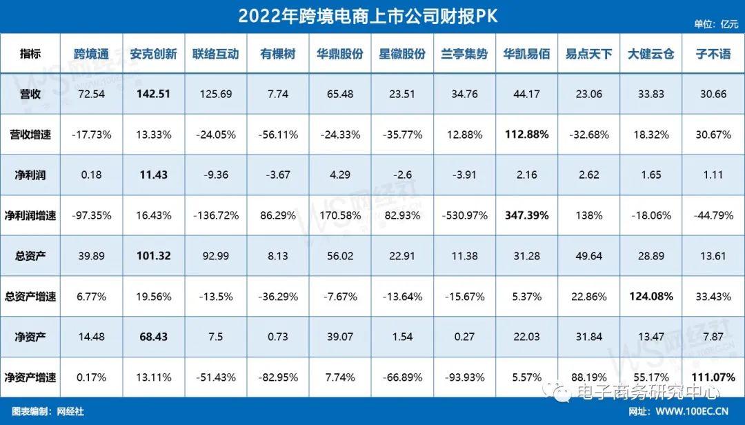 张周平称,增长率方面,总体呈现“五正六负”,华凯易佰增速最快,为112.88%,之后依次为子不语、大健云仓、安克创新、兰亭集势,其余六家公司均实现了不同程度的下降,下降幅度最大的是有棵树,下降超五成。2021年华凯易佰仅合并易佰网络7-12月财务数据。2022年,易佰网络实现营业收入43.83亿元,实现净利润2.81亿元元,促使公司整体经营业绩大幅度增长。有棵树2022年受不利因素影响,公司本年度跨境电商主业营收同比下滑60.11%。