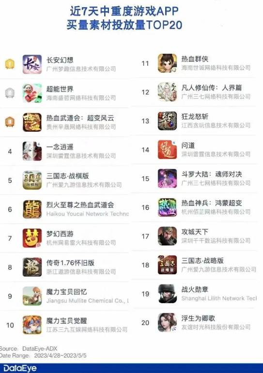 据DataEye的数据显示,在“五一”期间,在APP投放榜中,广州诗悦旗下《长安幻想》占据榜单首位,除此之外,阿里、网易、雷霆、贪玩、三七等厂商均有产品跻身TOP20的位置。一位头部游戏大厂的员工向Tech星球坦陈,如果不是资金审核严格,恨不得让上面多批些预算,帮助项目组的游戏能够向更多渠道进行展示。