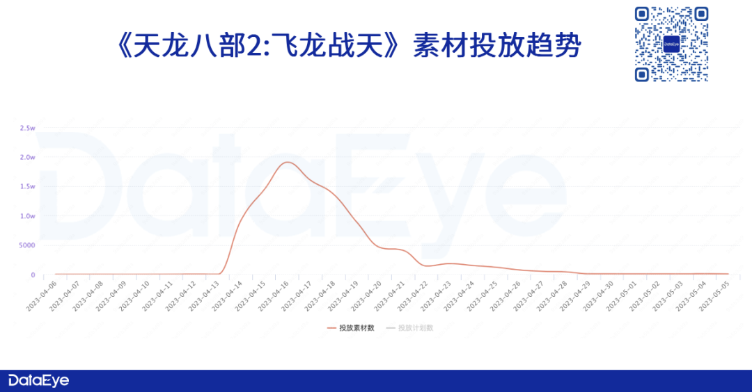 但实际情况是,MMO大厂们似乎并没有在五一期间大手笔投放。如《天龙八部2:飞龙战天》在五一期间投放量大幅回落,与上线当天素材投放量形成鲜明对比。