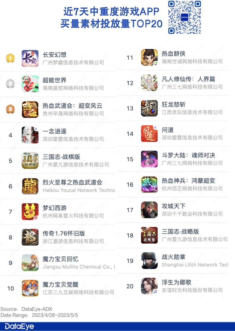 DataEye-ADX数据显示,在APP投放榜中,广州诗悦旗下《长安幻想》占据榜单首位,除此之外,阿里、网易、雷霆、贪玩、三七等大厂均有产品跻身TOP20的位置。